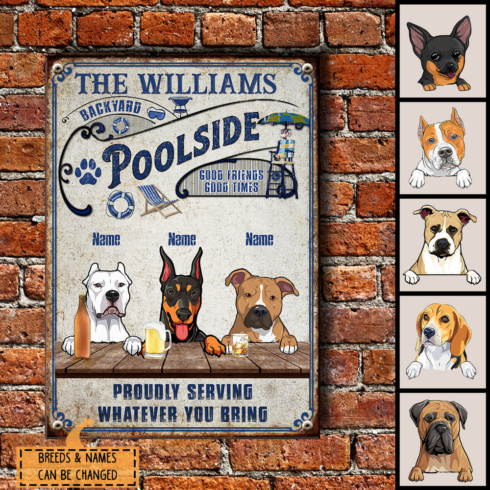 Backyard Poolside Good Friends Good Times Proudly Serving Whatever You Bring, Personalized Dog Breeds Metal Sign