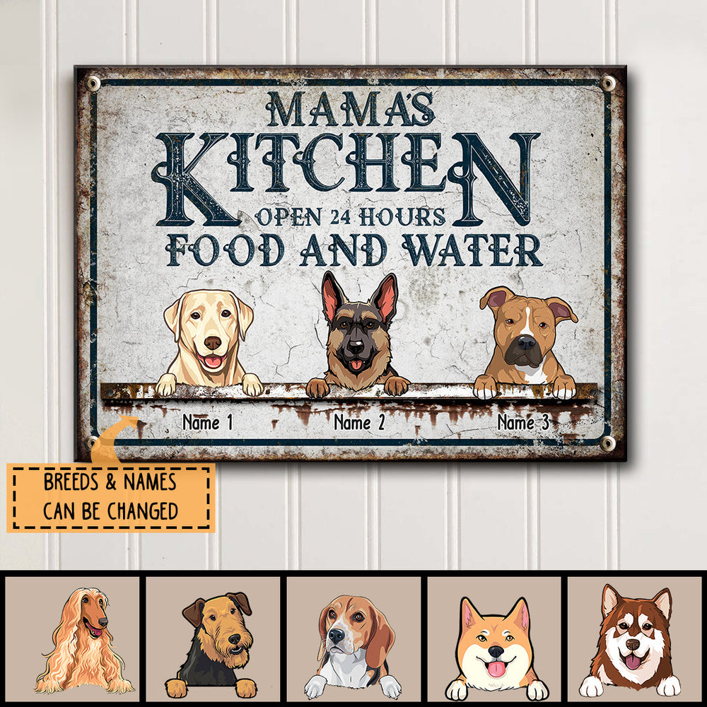 Mama's Kitchen Open 24 Hours Food And Water, Vintage Style, Personalized Dog Breeds Metal Sign