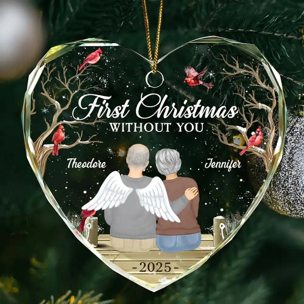 Cherish precious memories with the First Christmas Without You Memorial - Personalized Heart Shaped Glass Ornament. This sentimental piece serves as a heartfelt reminder for those navigating the emotions of loss during the holiday season. It makes a unique and thoughtful gift for couples, old couples, husbands, wives, moms, dads, boyfriends, and girlfriends on Valentine's Day, Mother's Day, Father's Day, Thanksgiving, Christmas, birthdays, and anniversaries.