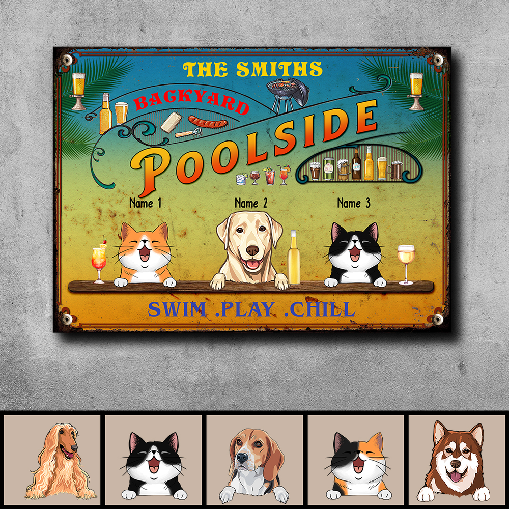 Metal Backyard Poolside Signs, Gifts For Pet Lovers, Swim Play Chill Drink & Food Personalized Family Sign