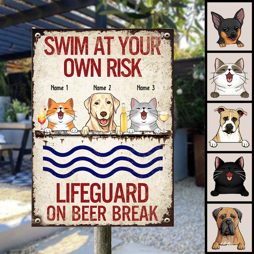 Metal Pool Sign, Gifts For Pet Lovers, Swim At Your Own Risk Lifeguard On Beer Break Funny Warning Signs