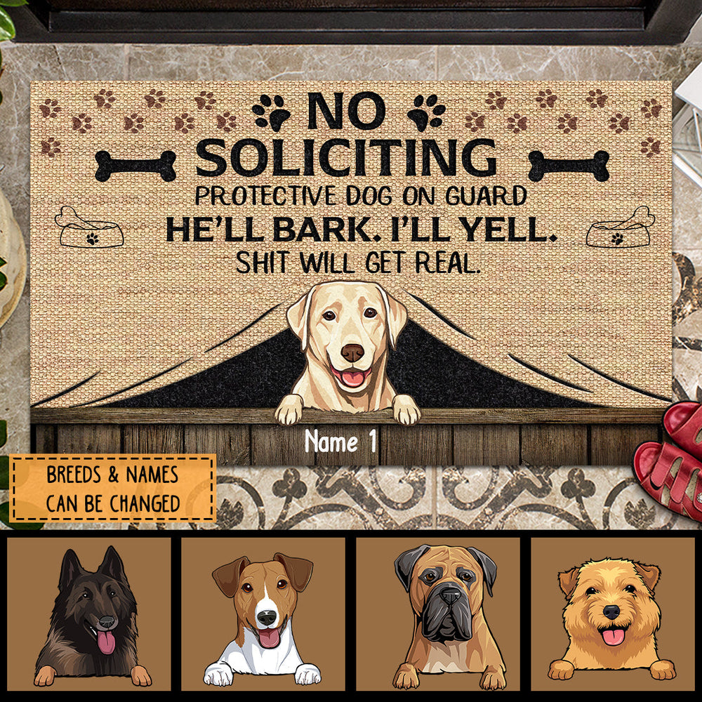 No Soliciting Protective Dog On Guard, They'll Bark, I'll Yell, Shit Will Get Real, Yellow Canvas Background, Personalized Dog Doormat