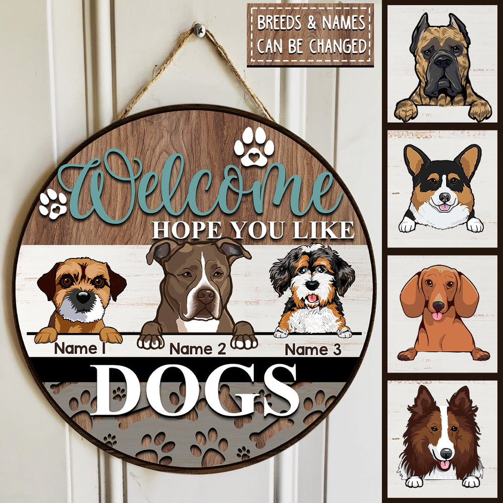 Welcome Hope You Like Dogs, Wooden Pawprints Door Hanger, Personalized Dog Breeds Door Sign, Front Door Decor
