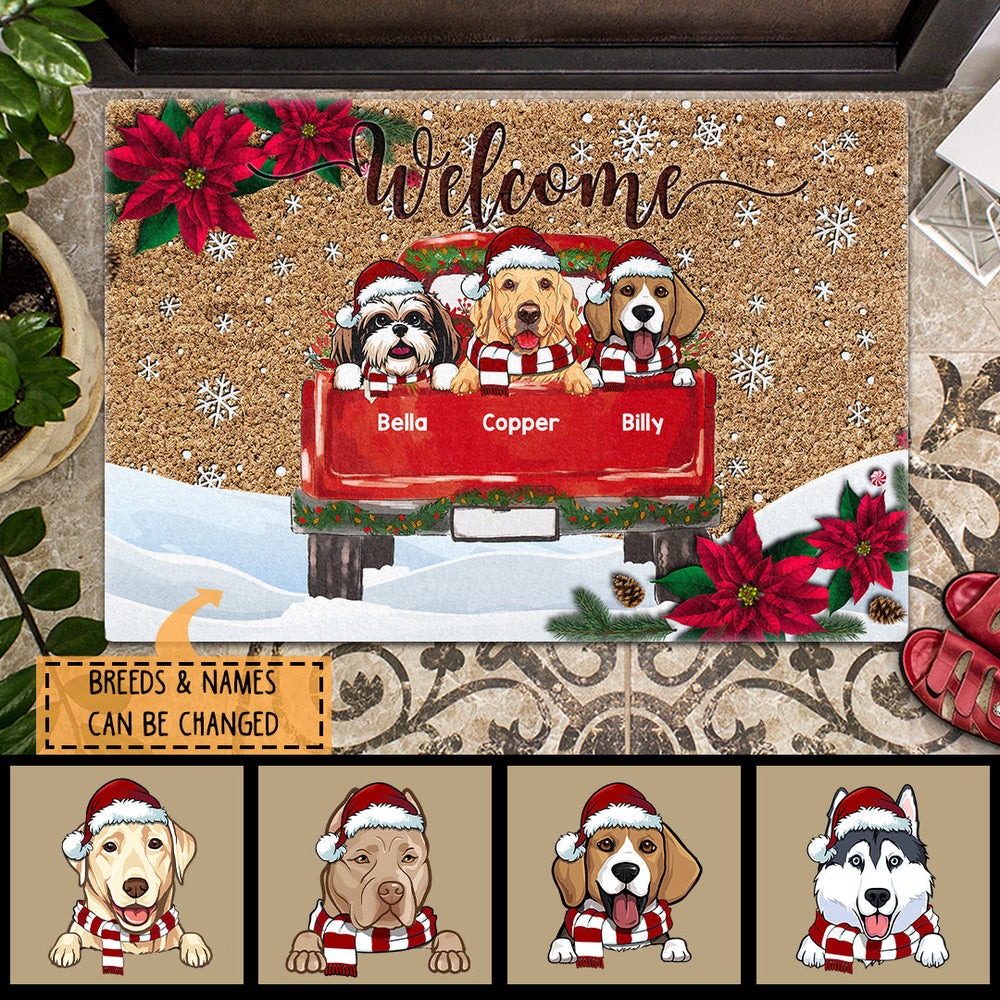 Welcome - Red Truck - Red Poinsettia - Personalized Dog Christmas Doormat