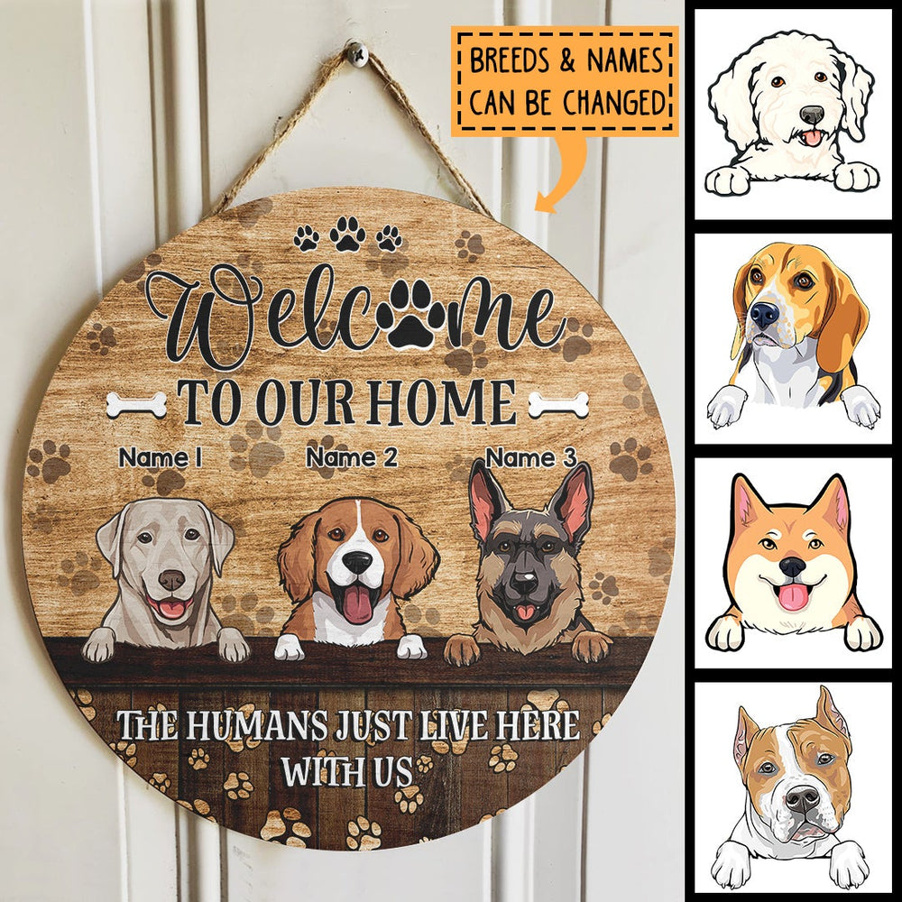 Welcome To Our Home, The Humans Just Live Here With Us, Dog Pawprints Background, Personalized Dog Lovers Door Sign