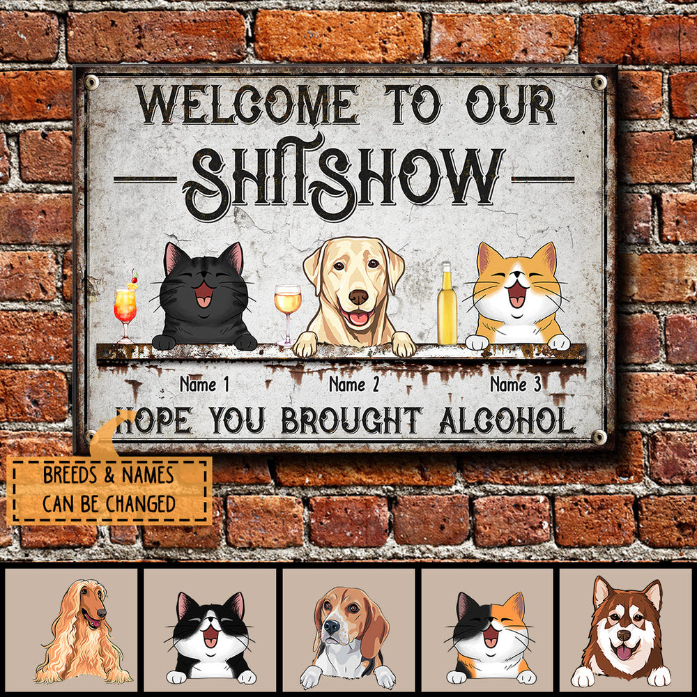 Welcome To Our Shitshow, Hope You Brought Alcohol, Laughing Pets & Beverages, Personalized Cat & Dog Lovers Metal Sign