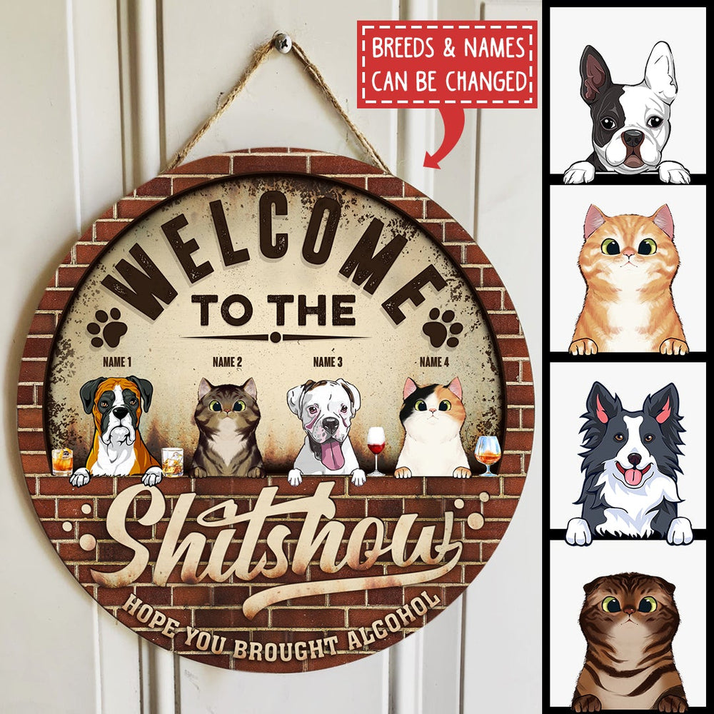 Welcome To The Shitshow Hope You Brought Alcohol, Retro Brick Door Hanger, Personalized Cat & Dog Door Sign